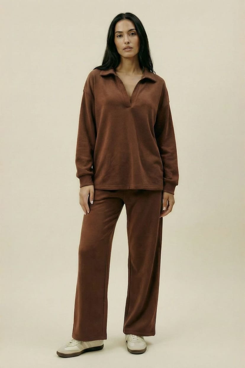 Luxurious loungewear set in chocolate brown featuring a long-sleeve top and wide-leg trousers. Crafted from buttery soft fabric for ultimate comfort, perfect for both lounging and dressing up.