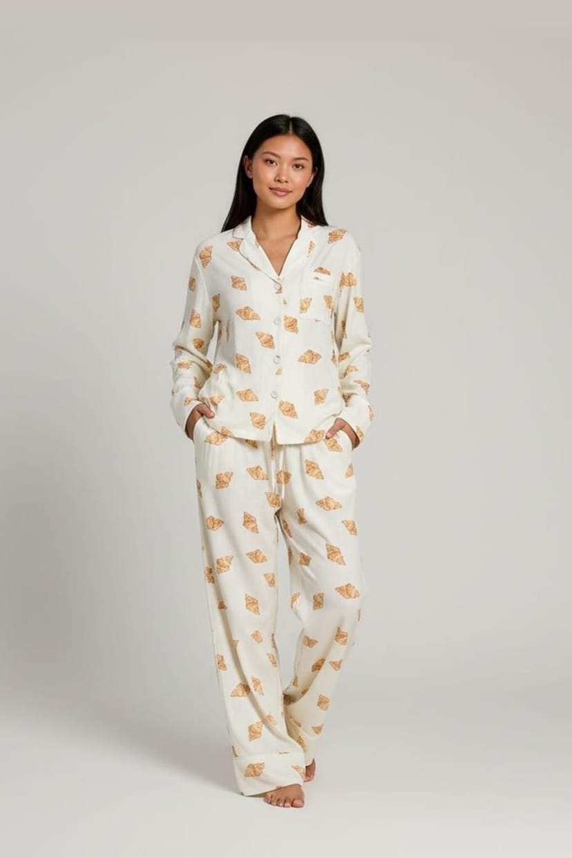 The The Night Store Off-White Croissant Pyjama Trouser Set is ideal for sleeping, relaxing.
