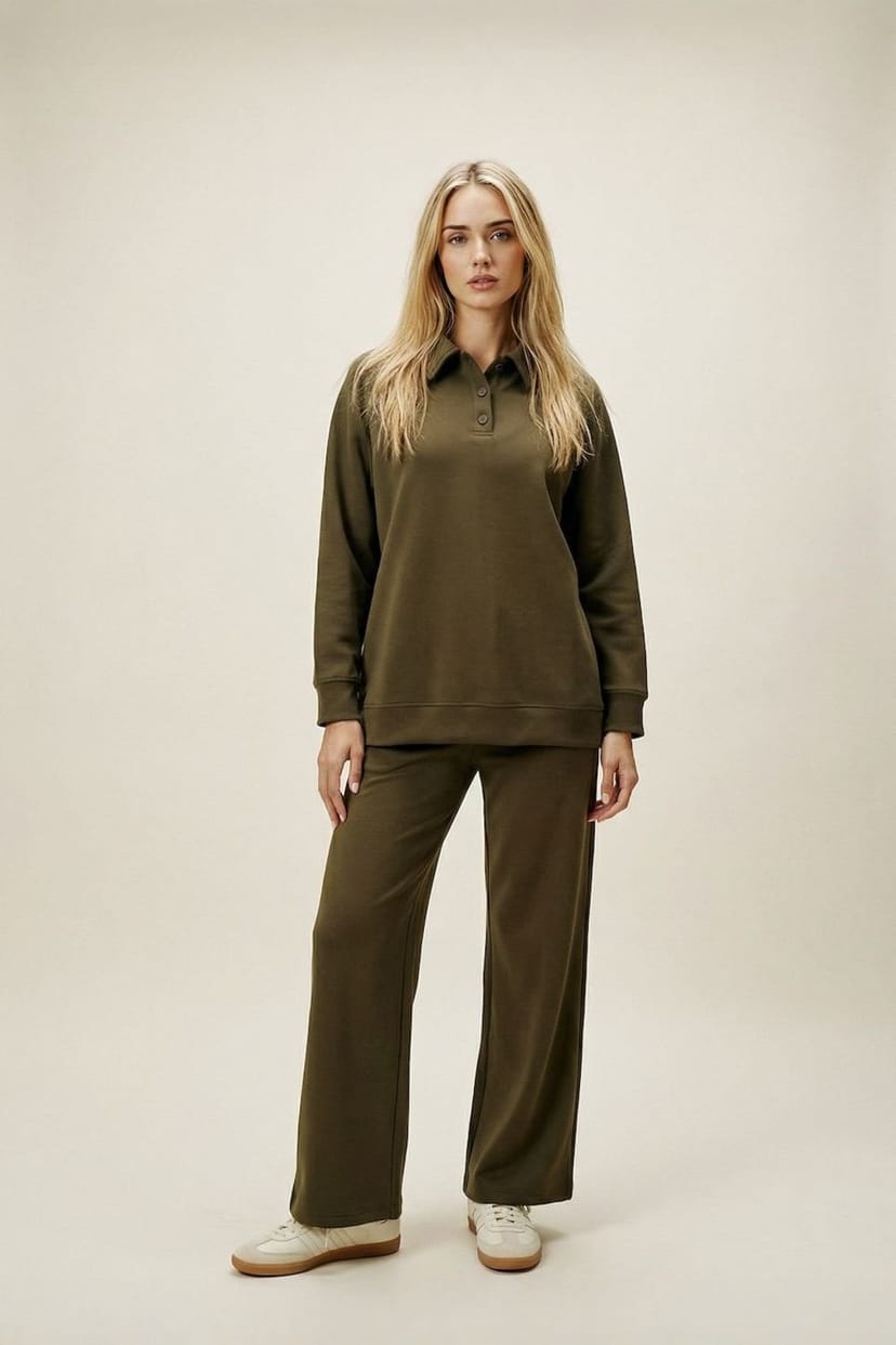 Luxurious loungewear set in olive green featuring a button collar top and wide-leg trousers. Crafted from soft fabric for ultimate comfort, perfect for both dressing up and down.
