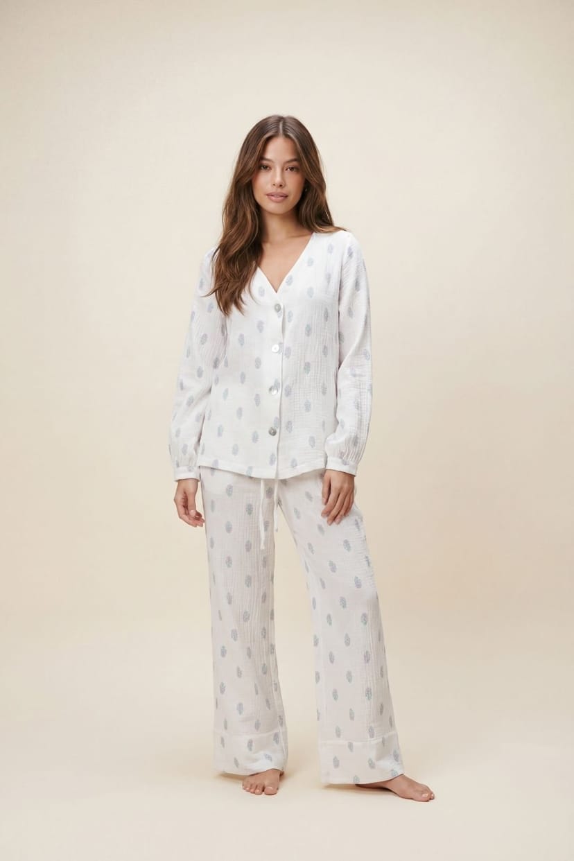 Wake up feeling effortlessly chic in our Floral Muslin Pyjama Trouser Set. Made from ultra-soft and breathable cotton muslin fabric, this dreamy set is designed for lightweight comfort, perfect for warm nights and lazy mornings. Featuring a relaxed button-up shirt and elasticated waist trousers, this set offers a stylish and comfortable sleepwear option.