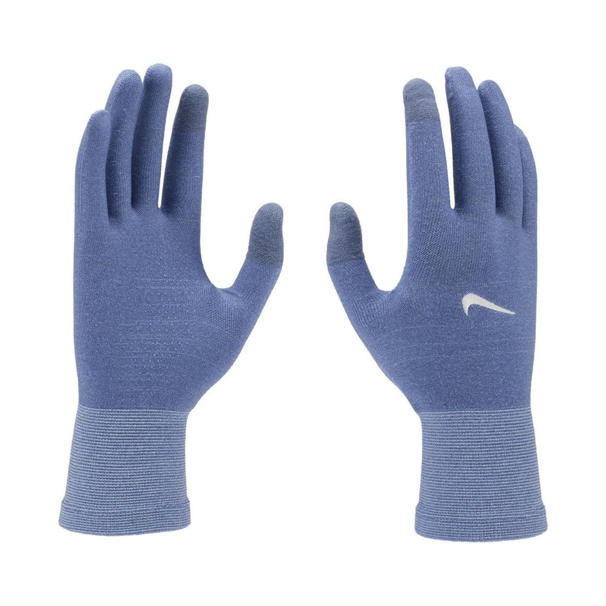 Lightweight knitted running gloves in blue. Made from 80% polyester, 12% nylon, and 8% spandex. Features Dri-FIT fabric technology and touchscreen fingertips.
