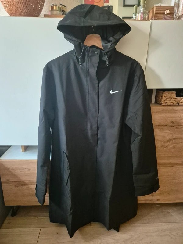 This long-line jacket is designed for inclement weather, featuring Nike's Storm-FIT technology to resist elements like wind and water while maintaining breathability. Includes a full-zip front with a protective hood, adjustable Velcro cuffs to seal out the wind, and secure zip pockets for essentials. Oversized S and will fit better size 12-14 hence listed as M