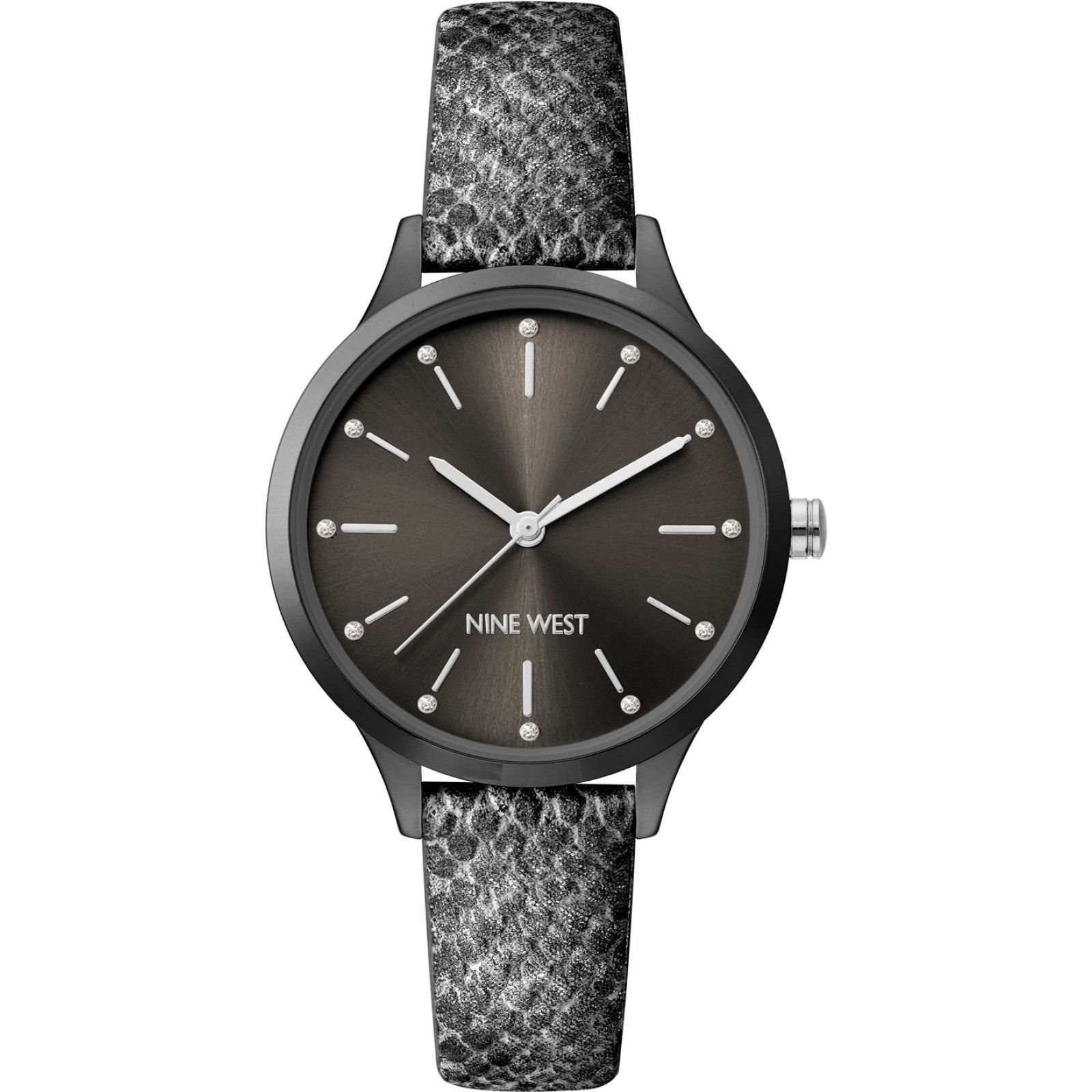 Stylish Nine West watch with a black dial and leather strap. Features crystal accents and a quartz movement for precise timekeeping. Ideal for everyday wear.
