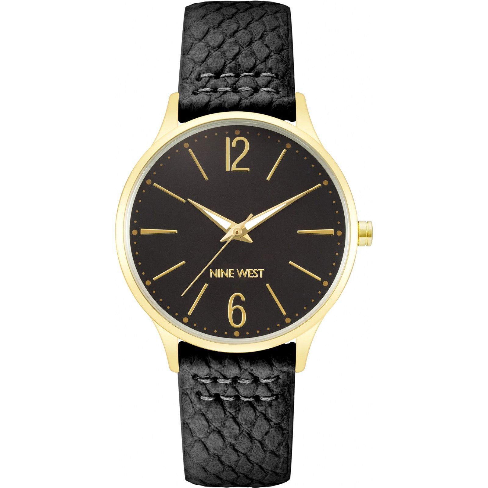 Stylish Nine West watch with a black dial and gold accents. Features a textured leather strap and quartz movement for precision. Ideal for everyday wear and special occasions.