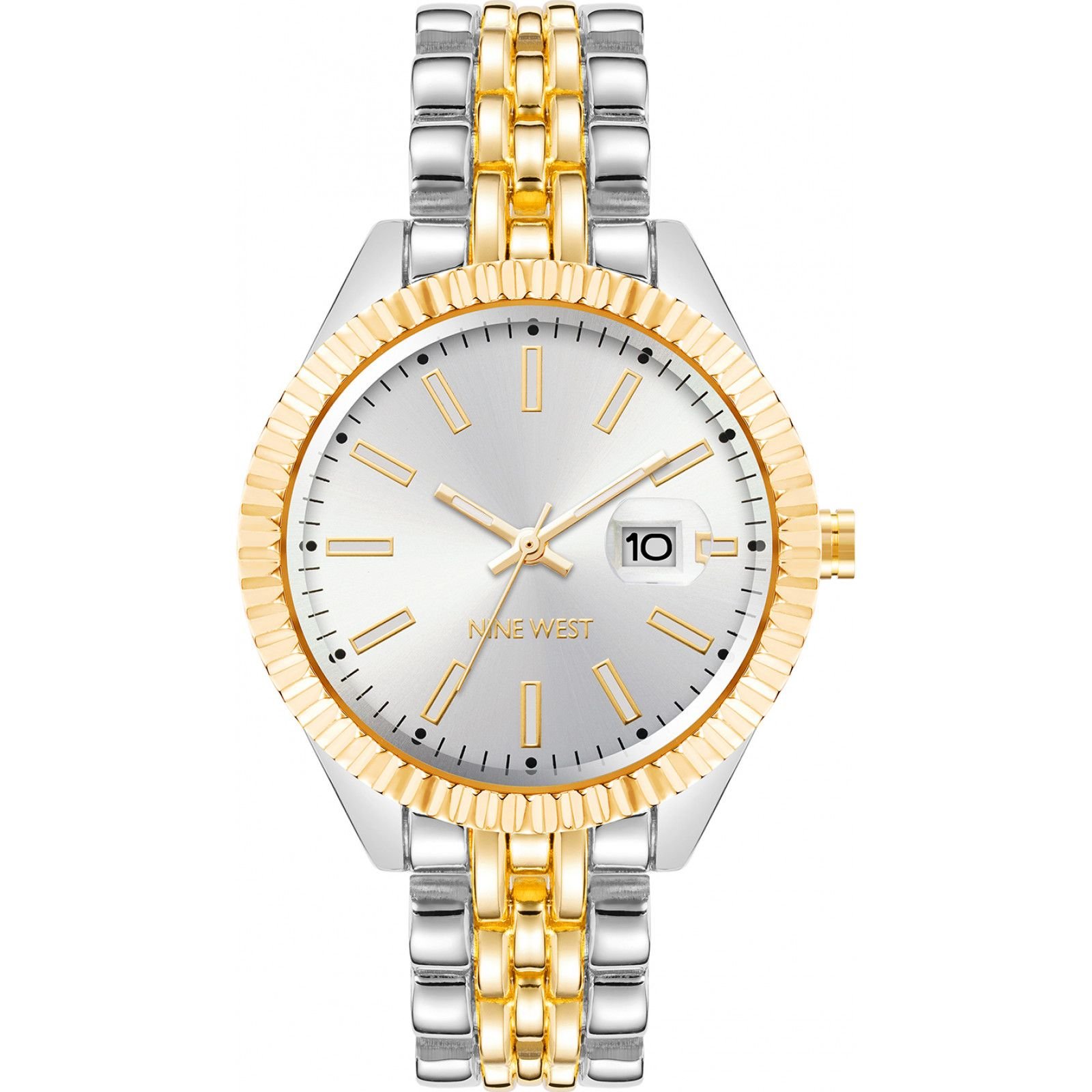Stylish Nine West watch with a two-tone design. Features a silver dial and a gold-tone metal bracelet with a link pattern. Perfect for adding a touch of elegance to any outfit.