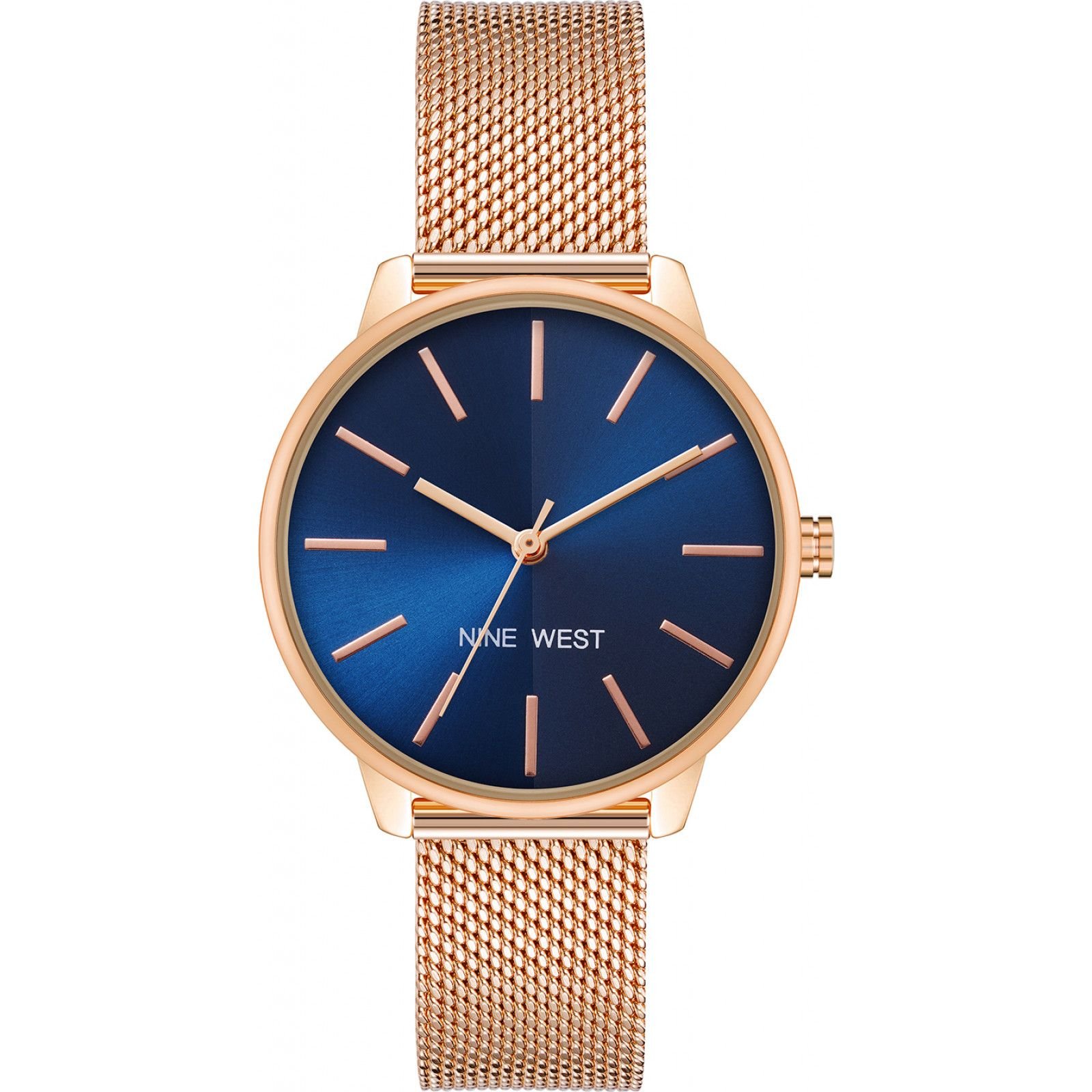 Stylish Nine West watch with a rose gold mesh band and a blue dial. Features a quartz movement for precise timekeeping. Ideal for everyday wear.