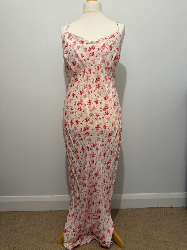 The No Label Floral Satin Midi Dress in Cream and Red is available in sizes L.