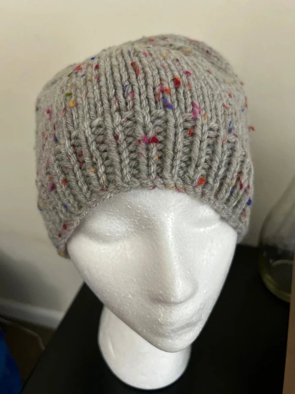 Handmade grey beanie with multicoloured specks of contrasting colours. Warm and cosy, perfect for chilly days. Measures 9.5 inches across the front