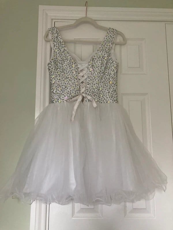 See all outfit ideasWhite V-neck Tulle Dress — the perfect choice for special occasions. Designed with a heavily embellished bodice featuring iridescent sequins and rhinestones, this fully lined dress boasts a layered tulle skirt. The lace-up back detail adds a touch of elegance. Ideal for events like wedding guests, evening parties, and formal gatherings.