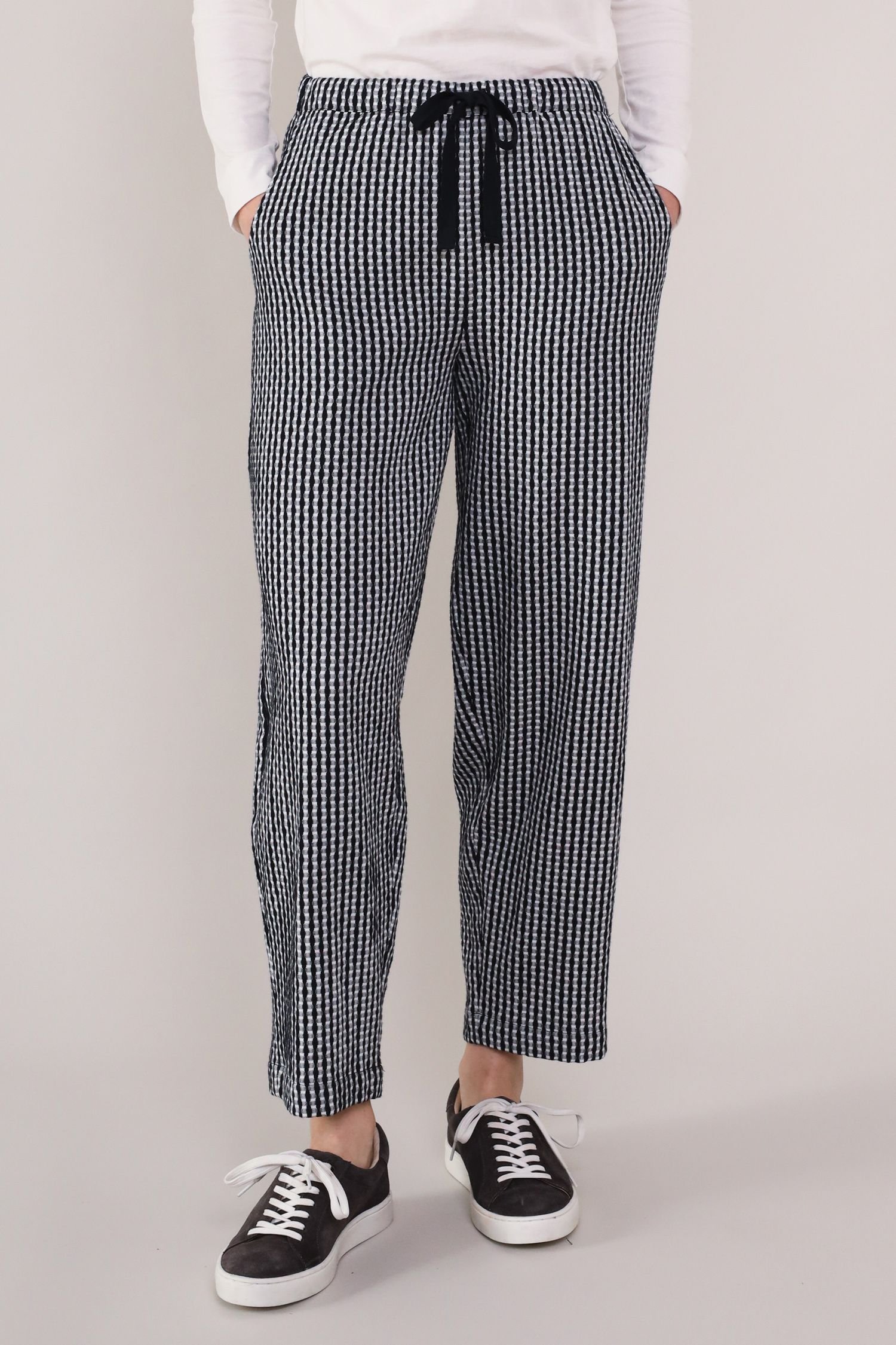 Stylish black check trousers made from 100% cotton. Featuring an elasticated waist, drawstring, and side pockets, these trousers are both practical and comfortable. Ideal for casual wear.