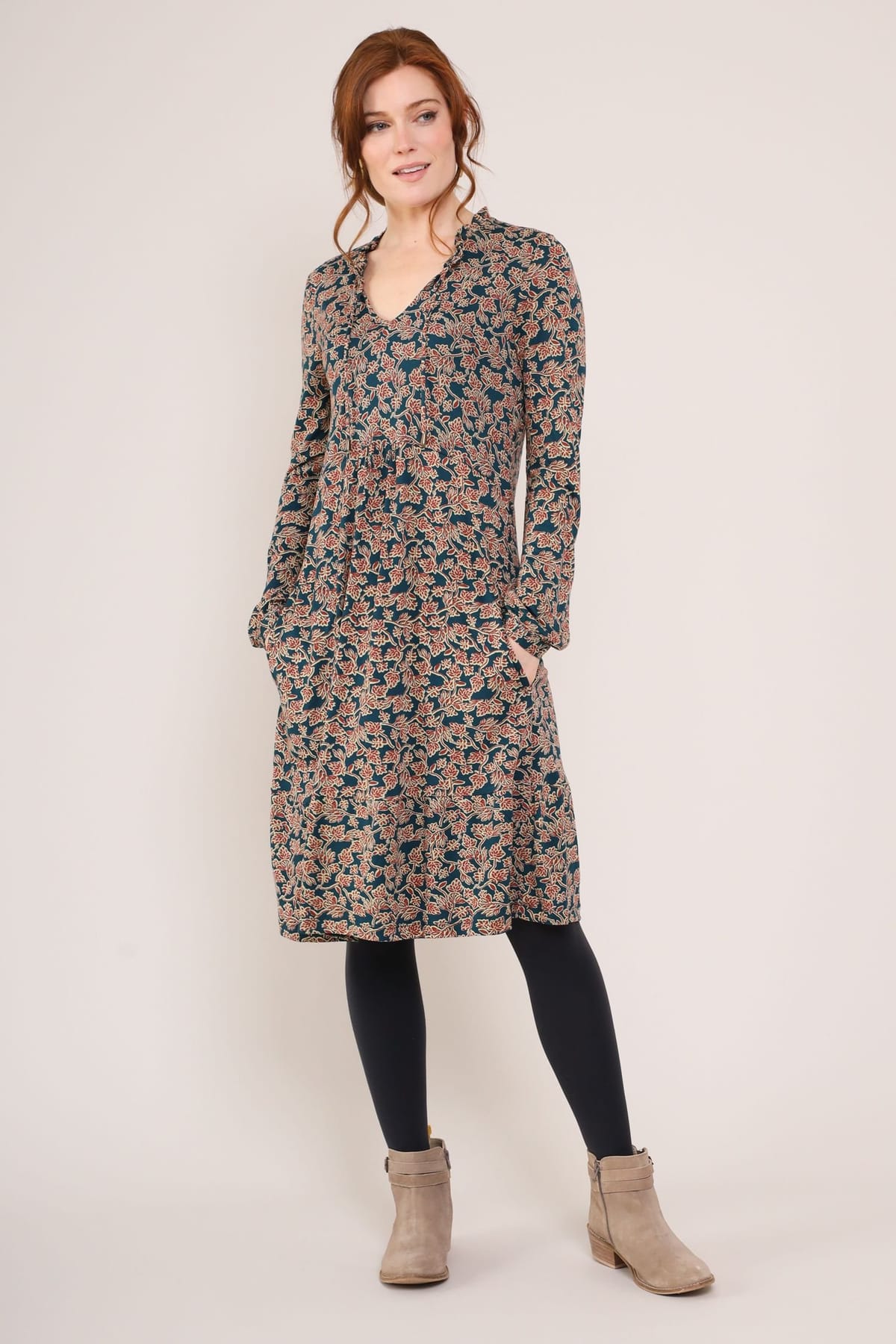 Stylish floral tunic dress in bottle green with a V-neckline and adjustable front tie. Features a frilly collar and long sleeves. Ideal for casual wear with leggings or tights.