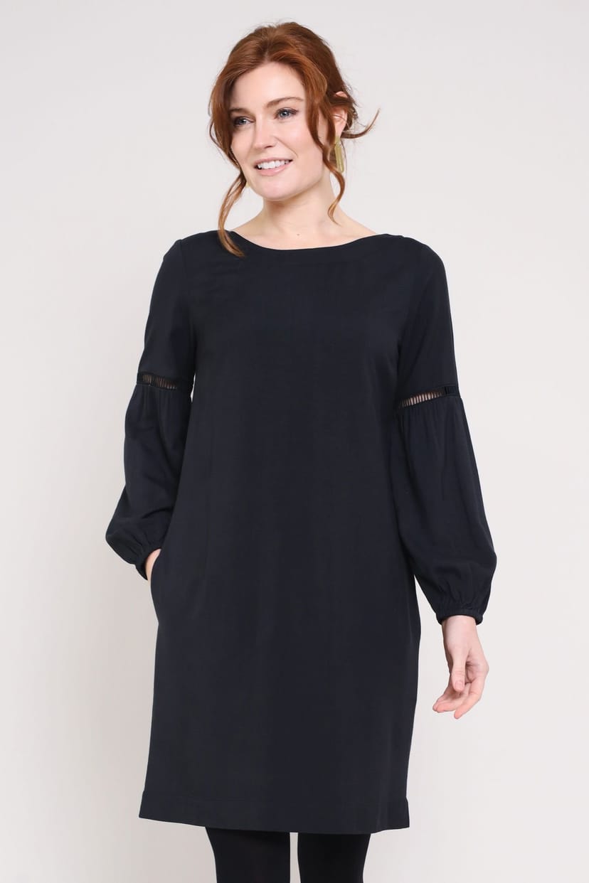 Modern tunic dress in dark grey viscose with a boat neckline, lace trim sleeve details, and gathered cuffs. Perfect for casual and semi-formal occasions.
