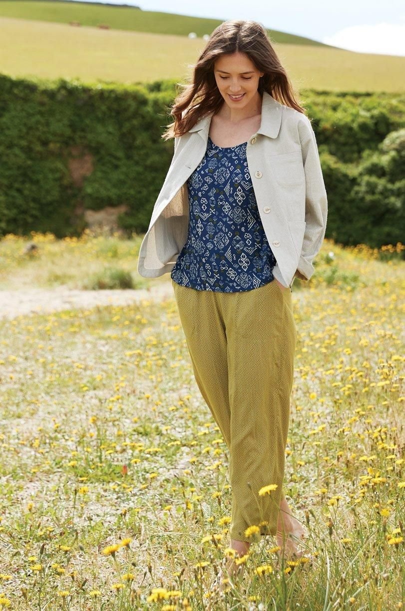Comfortable green viscose cropped trousers with a Finial print inspired by the Cornish Coasts. Features side pockets and an elasticated back waistband for a perfect fit. Ideal for holiday packing.