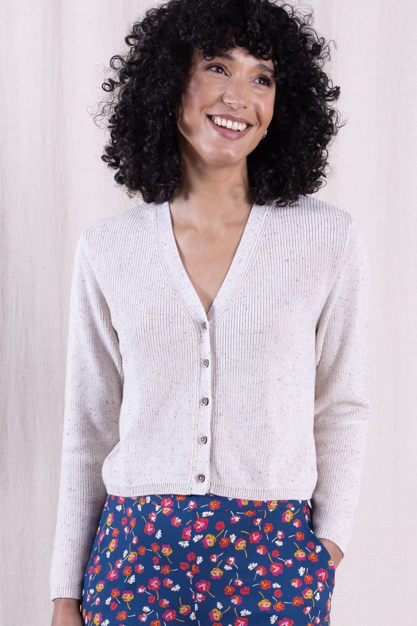 Stylish Ivory cotton cropped cardigan with a button front and long sleeves. Perfect for layering over your favourite tops. The soft fabric ensures comfort and warmth.