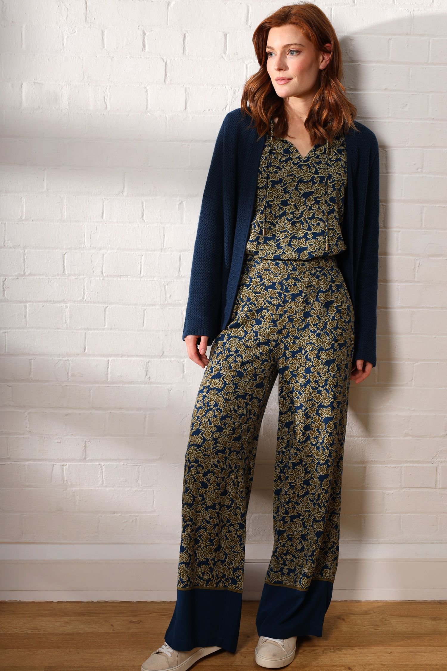 Stylish wide leg trousers in khaki viscose with a contrasting floral print. Features a relaxed fit, side pockets, and an elasticated back for comfort. Perfect for both casual and dressy occasions.