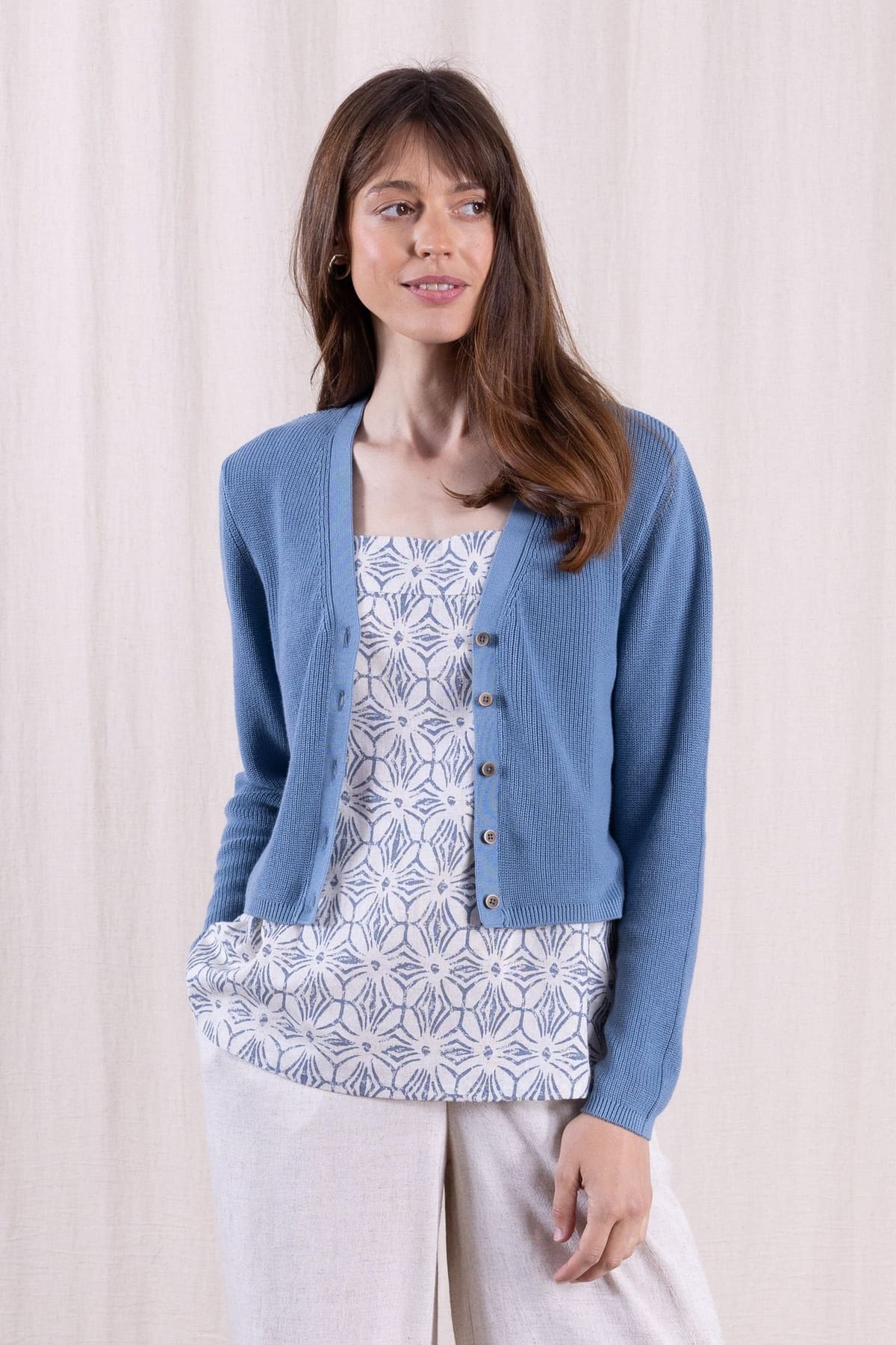 Light blue cotton cropped cardigan with a button front and long sleeves. Perfect for layering over your favourite tops. The soft fabric ensures warmth and comfort.