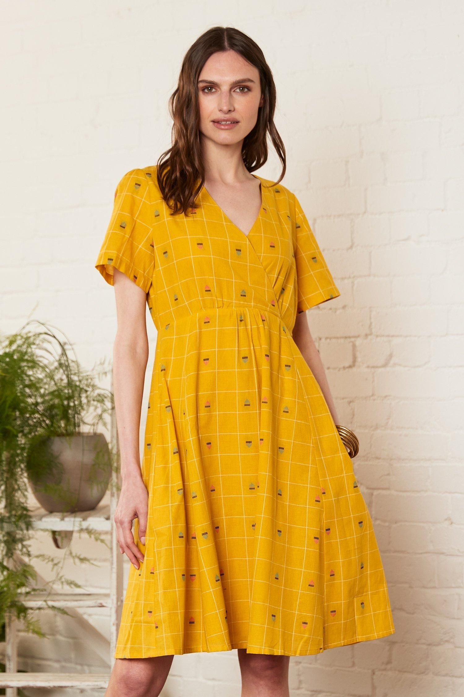 Bright and cheerful kimono-sleeve dress in mustard cotton with a playful grid pattern. Perfect for casual outings or summer events.