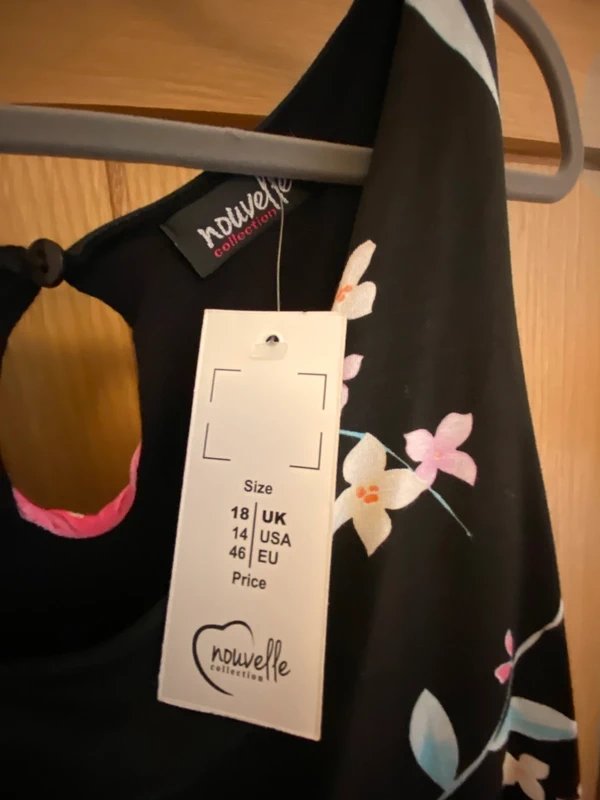 Never worn, new with tags on. Black and pink floral jumpsuit with pockets. Size 18. Beautiful.