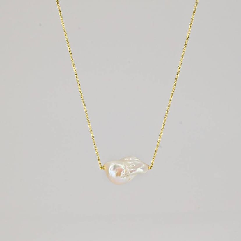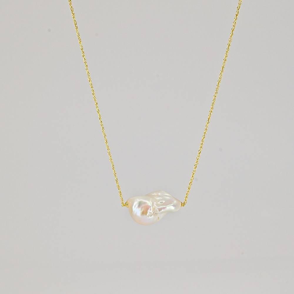 Elegant Nacre pearl necklace designed for everyday wear. Features a single irregular baroque pearl suspended from a fine 18k gold chain, finished with Nudie's signature Nudie Kiss counterweight. Perfect for adding a touch of luxury to any outfit.