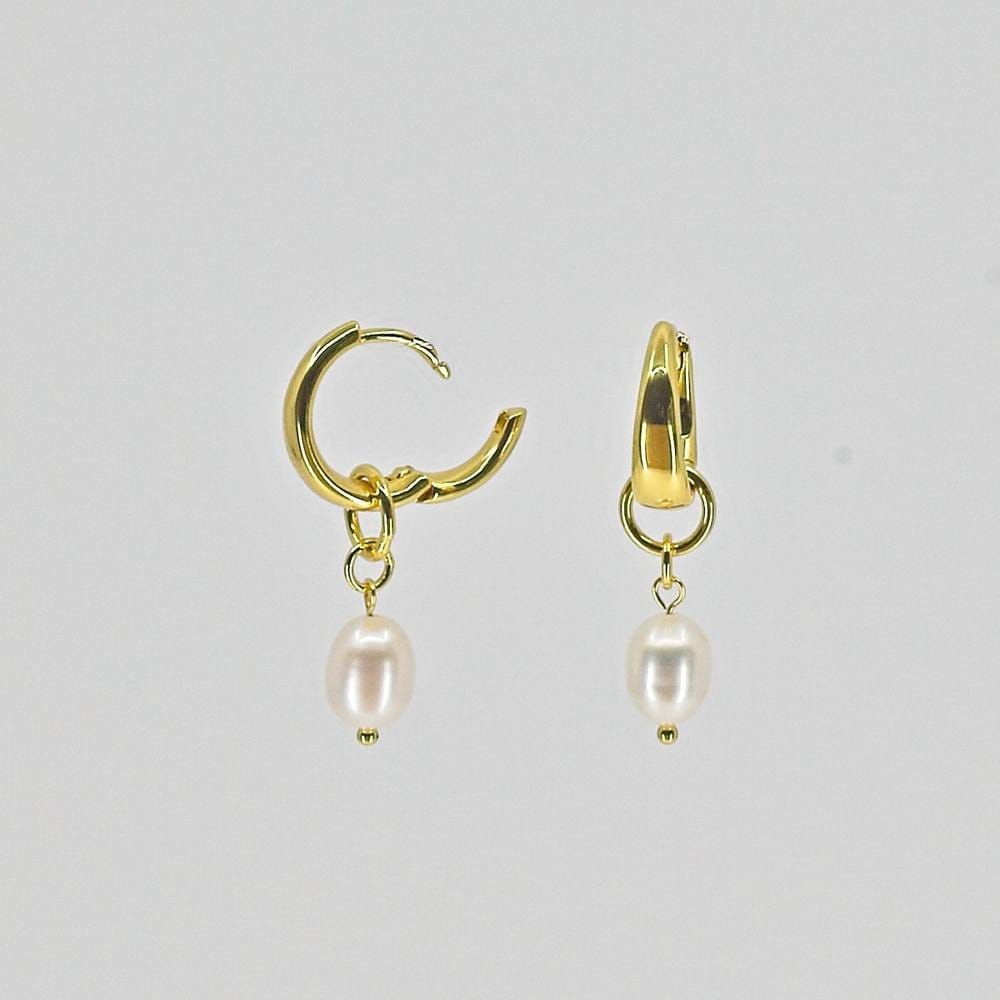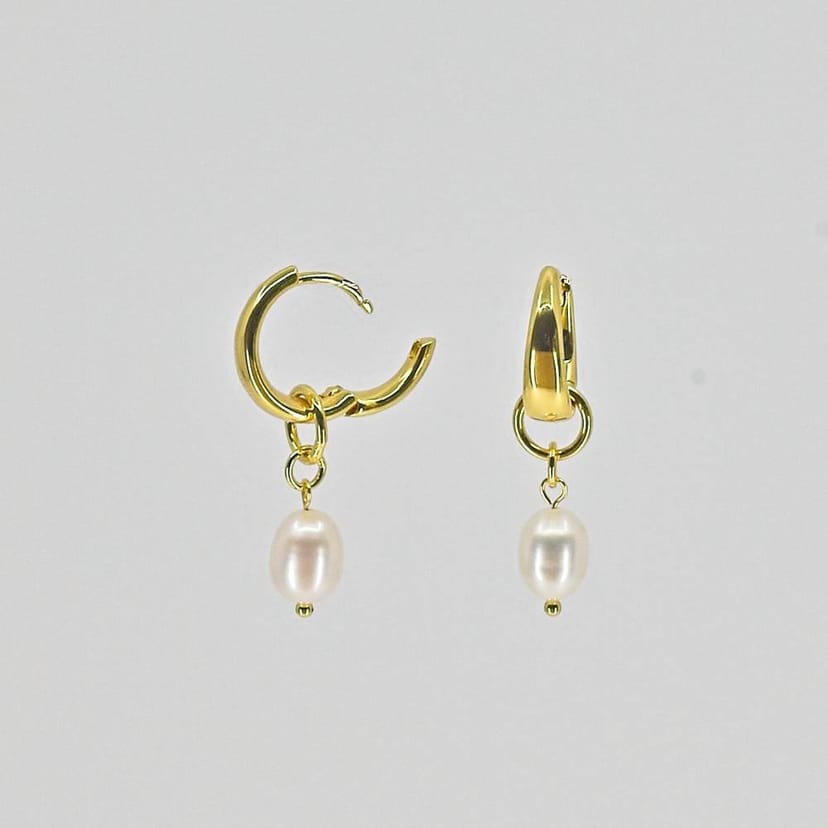 Elegant gold pearl huggie earrings by Nudie Jewellery. Featuring a removable pearl charm for versatile styling. Perfect for everyday wear.