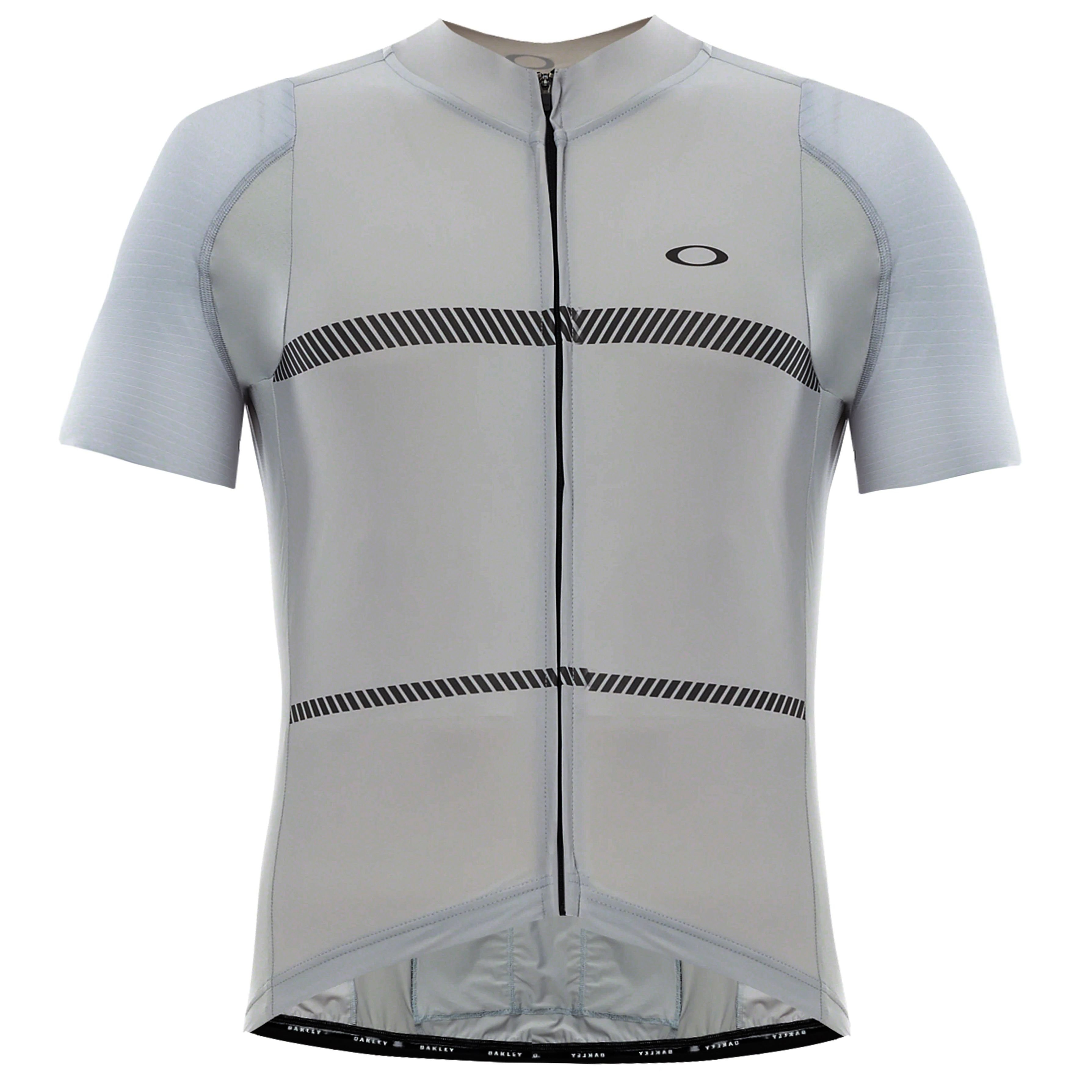 Stylish grey premium jersey cycling t-shirt by Oakley. Designed for comfort and performance, it features a zipper closure, ventilated side panels, and reflective detailing for visibility. Ideal for cycling and gym training.