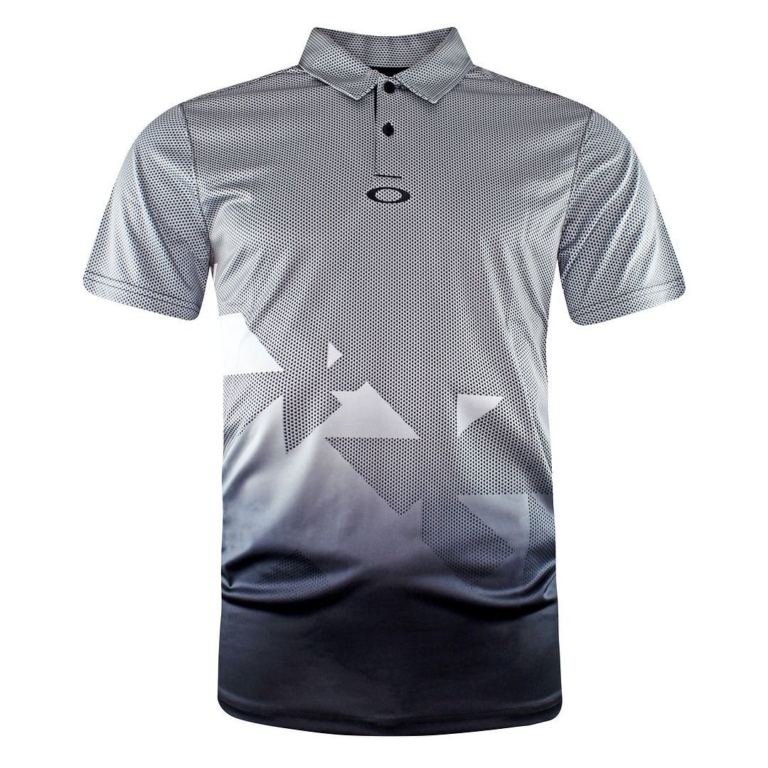 Stylish grey polo shirt by Oakley, designed for urban golf. Features a modern geometric pattern and a collared neckline. Made from lightweight, breathable fabric for comfort.