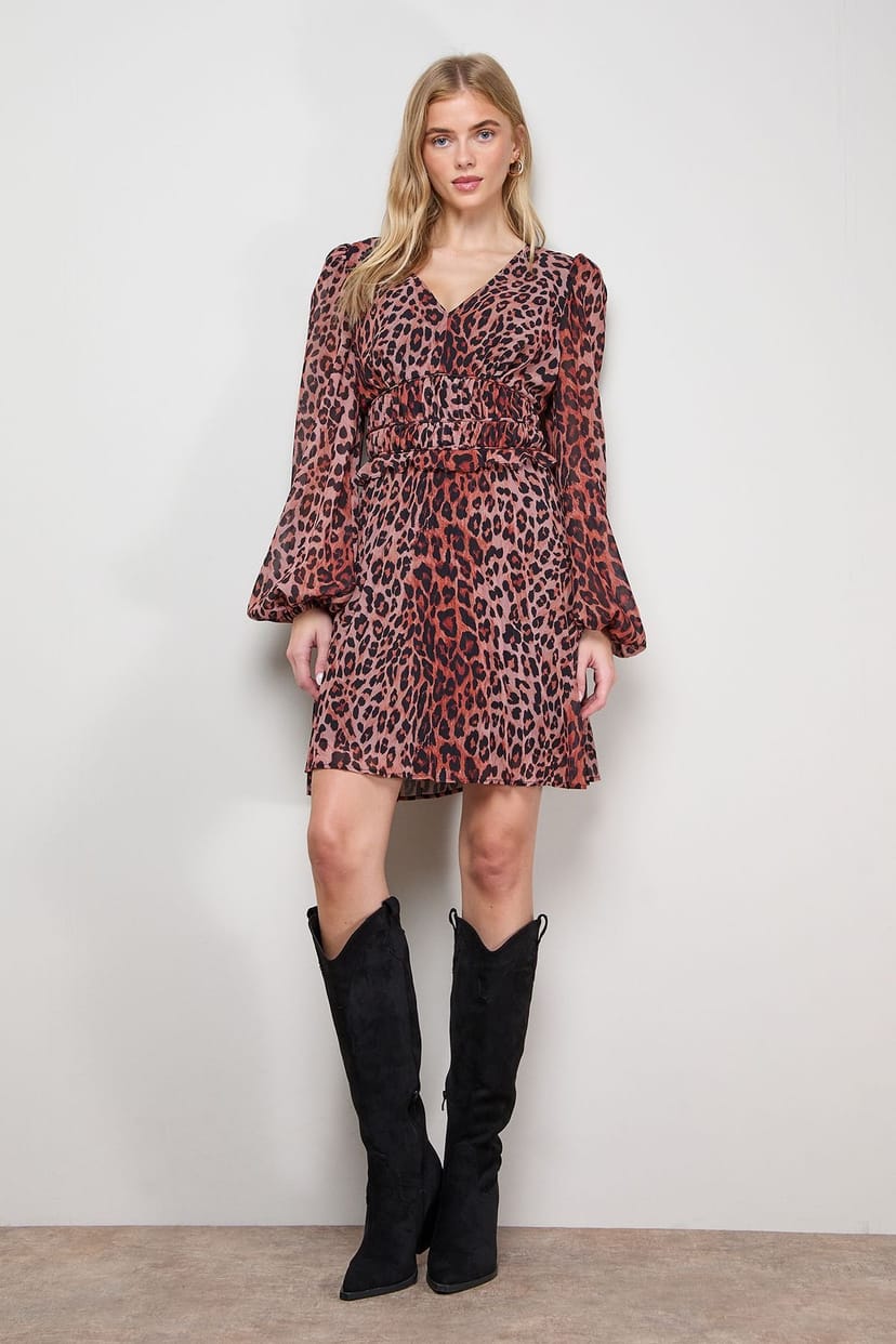 Striking animal print mini dress with a V-neckline and bell sleeves. Features a flattering empire waistline and a feminized pleated skirt. Ideal for showcasing your favourite boots.