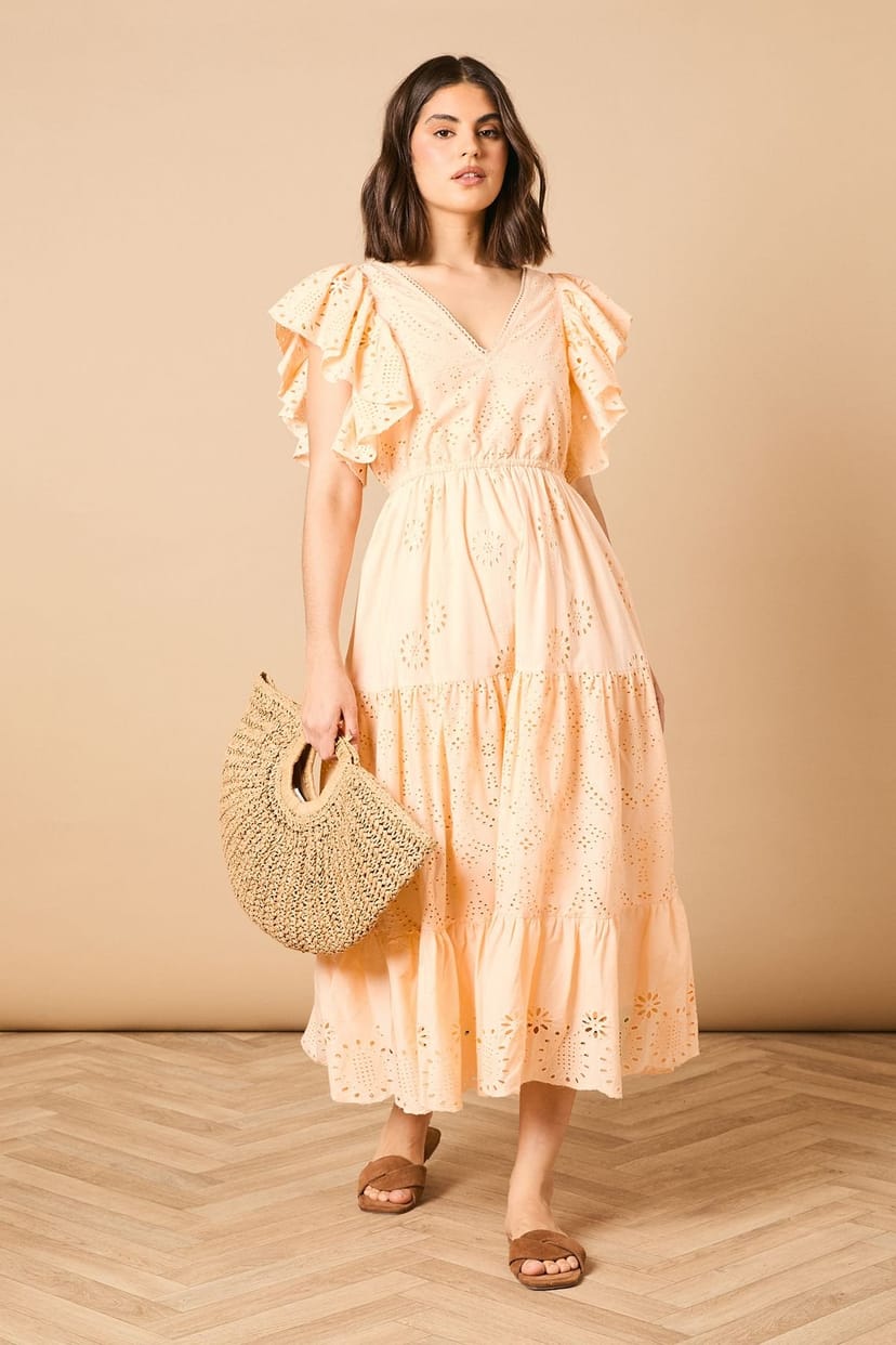 Charming Apricot broderie anglaise maxi dress with a flattering V-neckline. Angel sleeves with ruffle detailing add a romantic touch. The tiered maxi skirt offers a flowing silhouette. Perfect for special occasions.