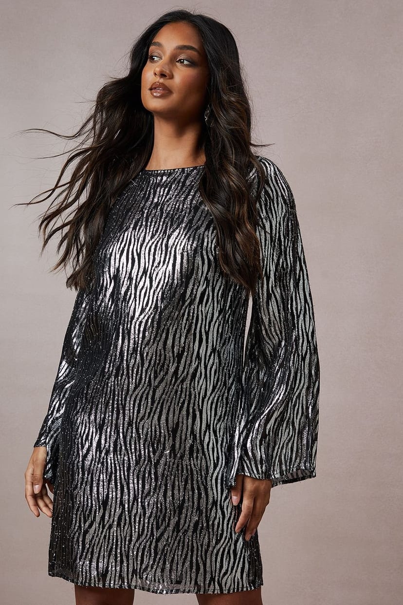 Striking zebra-inspired metallic pattern. Elegant mini length for a chic silhouette. Long sleeves with subtle flare for added drama. Crew neckline for a classic touch. Eye-catching open back detail for a sultry twist.