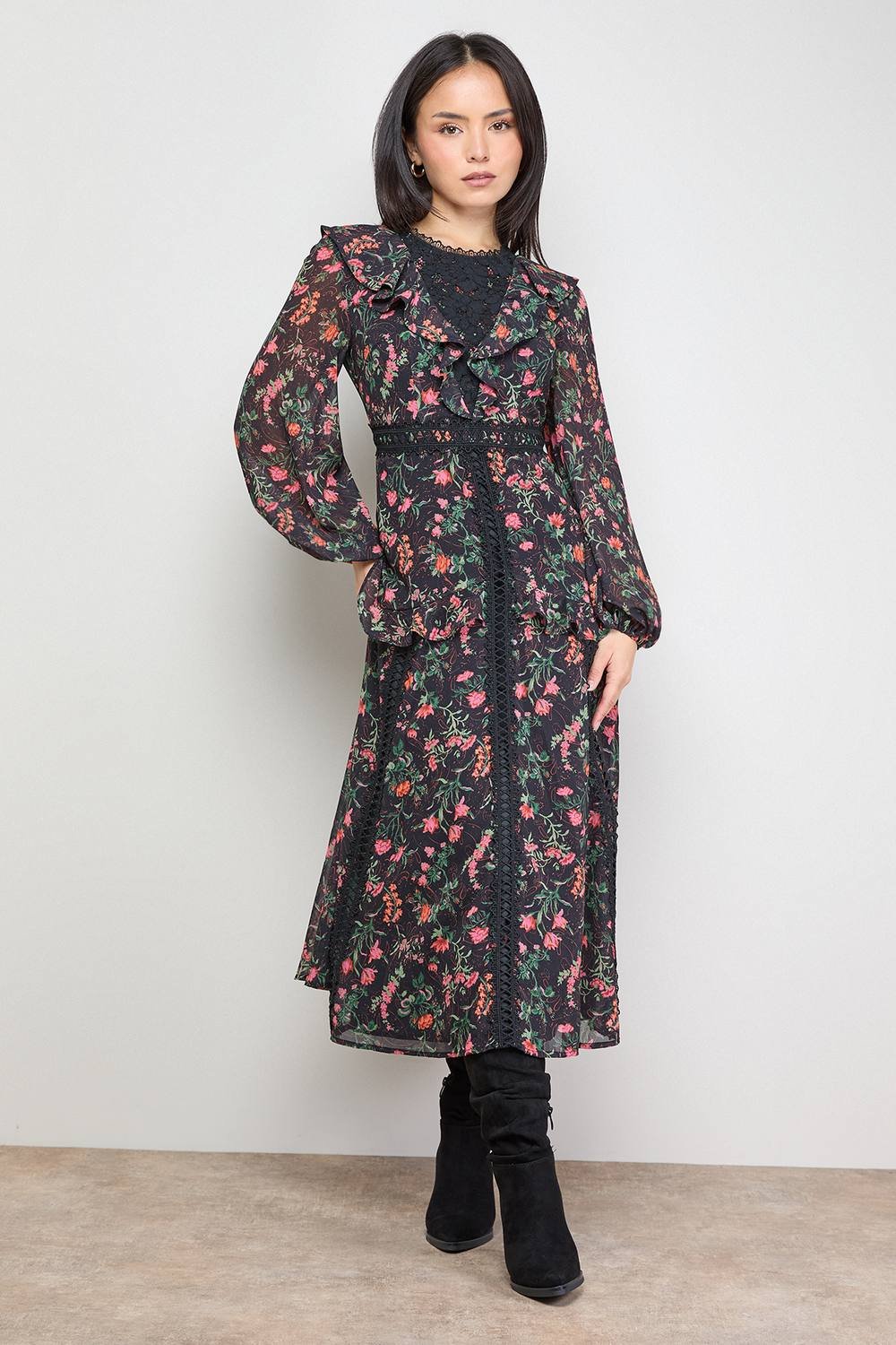 The Oasis Black Chiffon Floral Lace Trim Midi Dress is available in sizes 10, 12, 14, 16, 8.