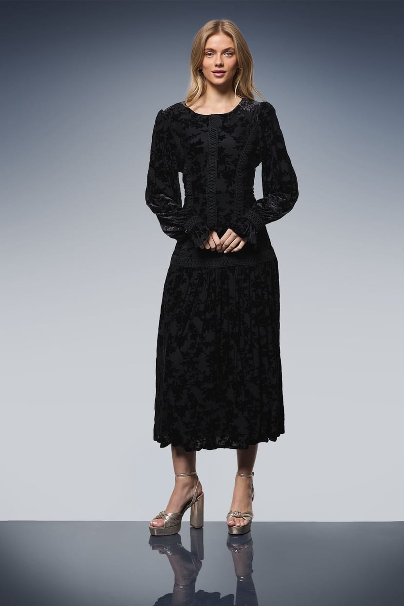 Striking black velvet boho maxi dress with elegant panelled detailing. Flattering long sleeves with subtle volume for a feminine silhouette. Intricate trim detailing along the centre front adds visual interest. Midi-length design with a flowing skirt that moves beautifully. Round neckline creates a classic look.