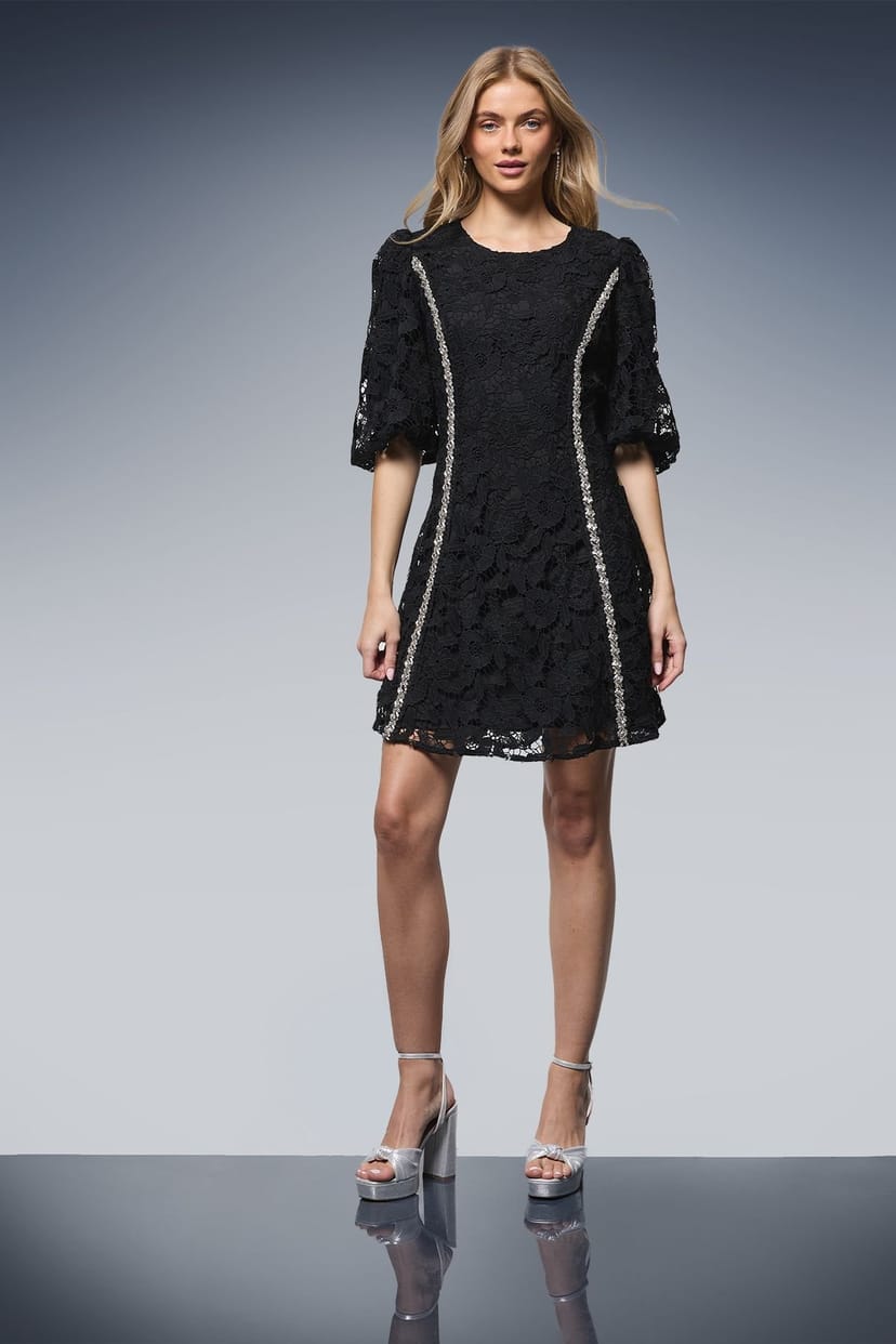 Stunning black lace mini dress with decorative metallic trim detailing. Dramatic volume puff sleeves for a contemporary silhouette. Elegant round neckline complementing the feminine design. Flattering A-line shape that skims the figure beautifully.