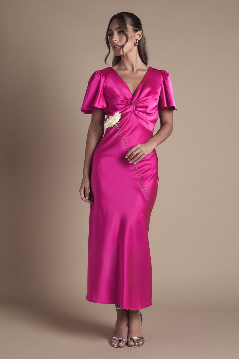 Elegant bright pink satin midi bridesmaid dress with a twist front detail and graceful angel sleeves. The V-neckline frames the dcolletage beautifully, and the smooth satin finish catches the light as you celebrate.