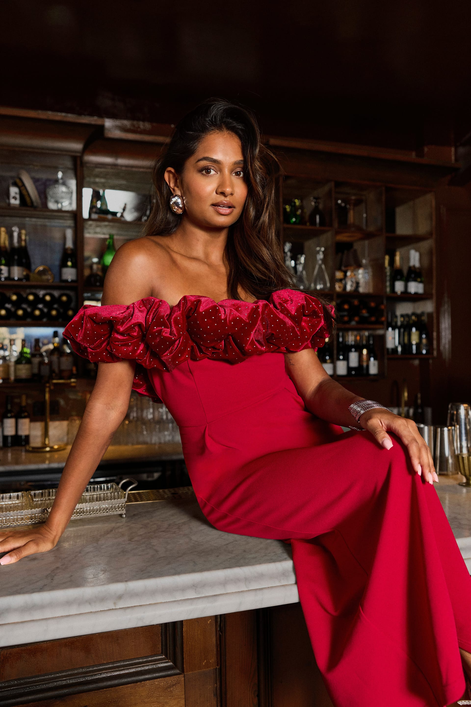 Back to Oasis Burgundy Velvet Bardot Bodycon Midi Dress →