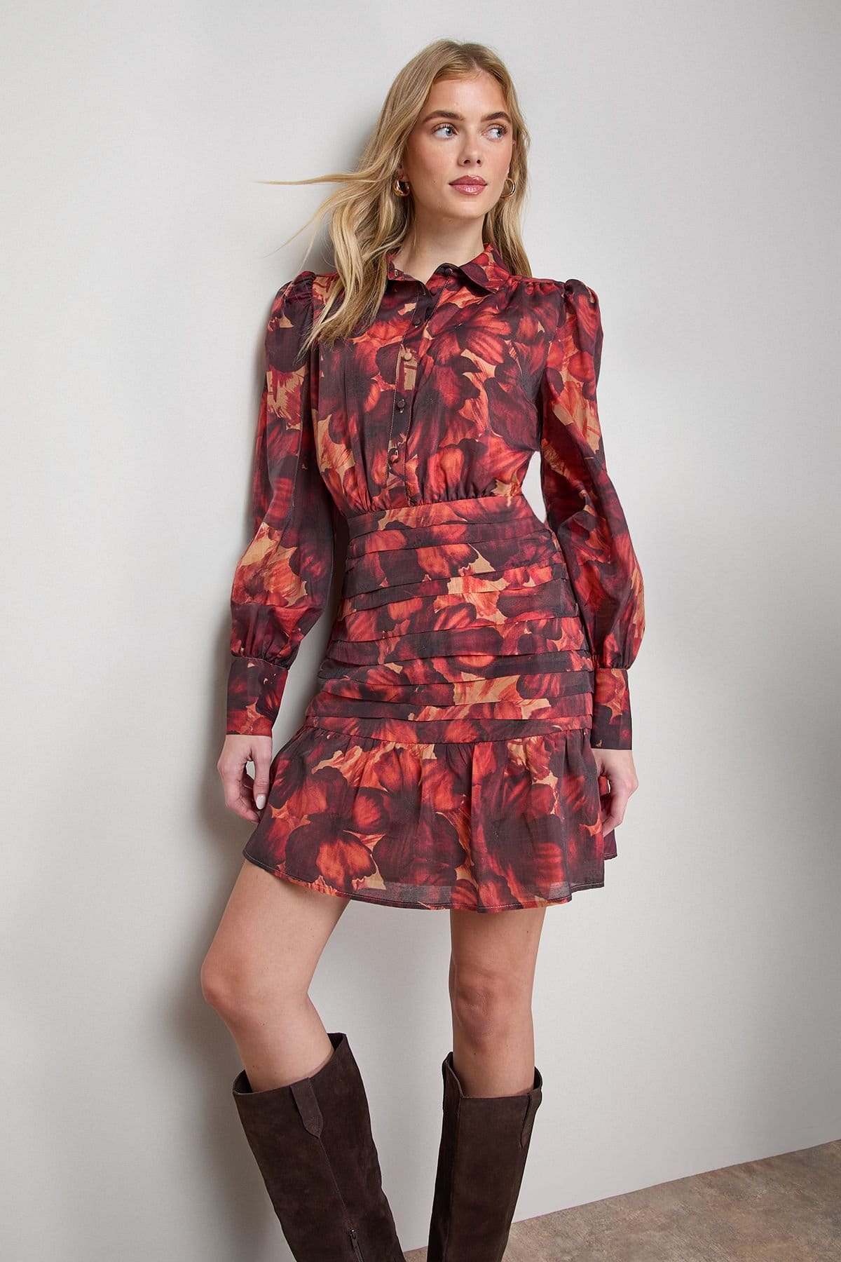 Striking floral print mini dress with a button-up design and elegant collar detail. Features voluminous long sleeves with fitted cuffs and a tiered waistband for a feminine silhouette. The playful flounced hem adds movement.