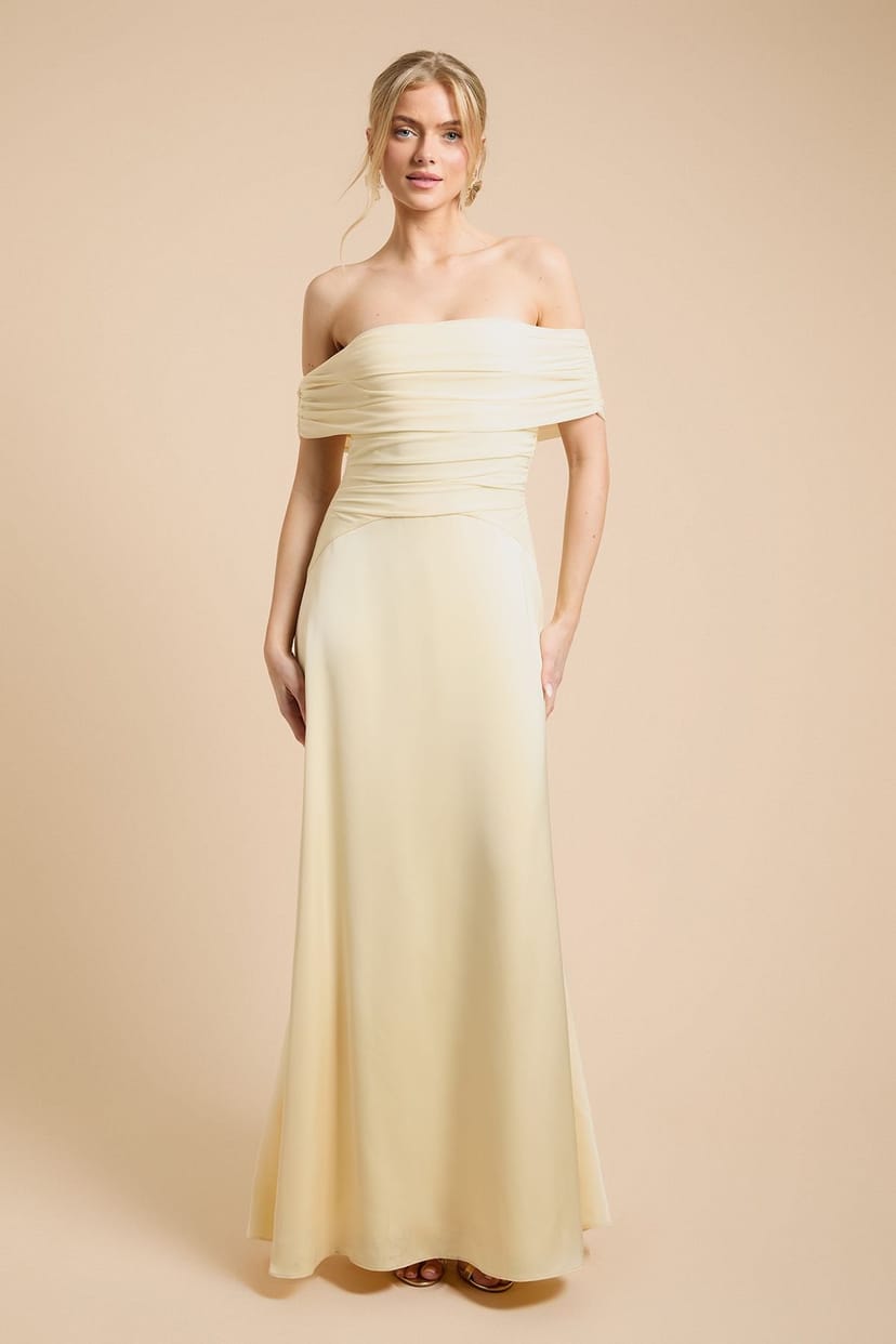 This butter satin bridesmaid dress by Oasis features an off-the-shoulder neckline with ruched detailing and a flowing A-line silhouette. Ideal for special occasions.