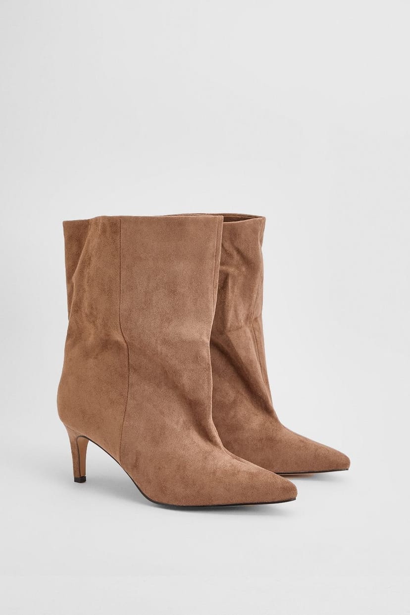 The Oasis Camel Faux Suede Pointed Heel Ankle Boots is ideal for casual, evening, date-night.