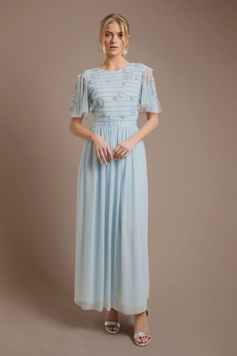 The Oasis Dusty Blue Floral Embellished Mesh Maxi Dress is available in sizes 10, 12, 14, 16.