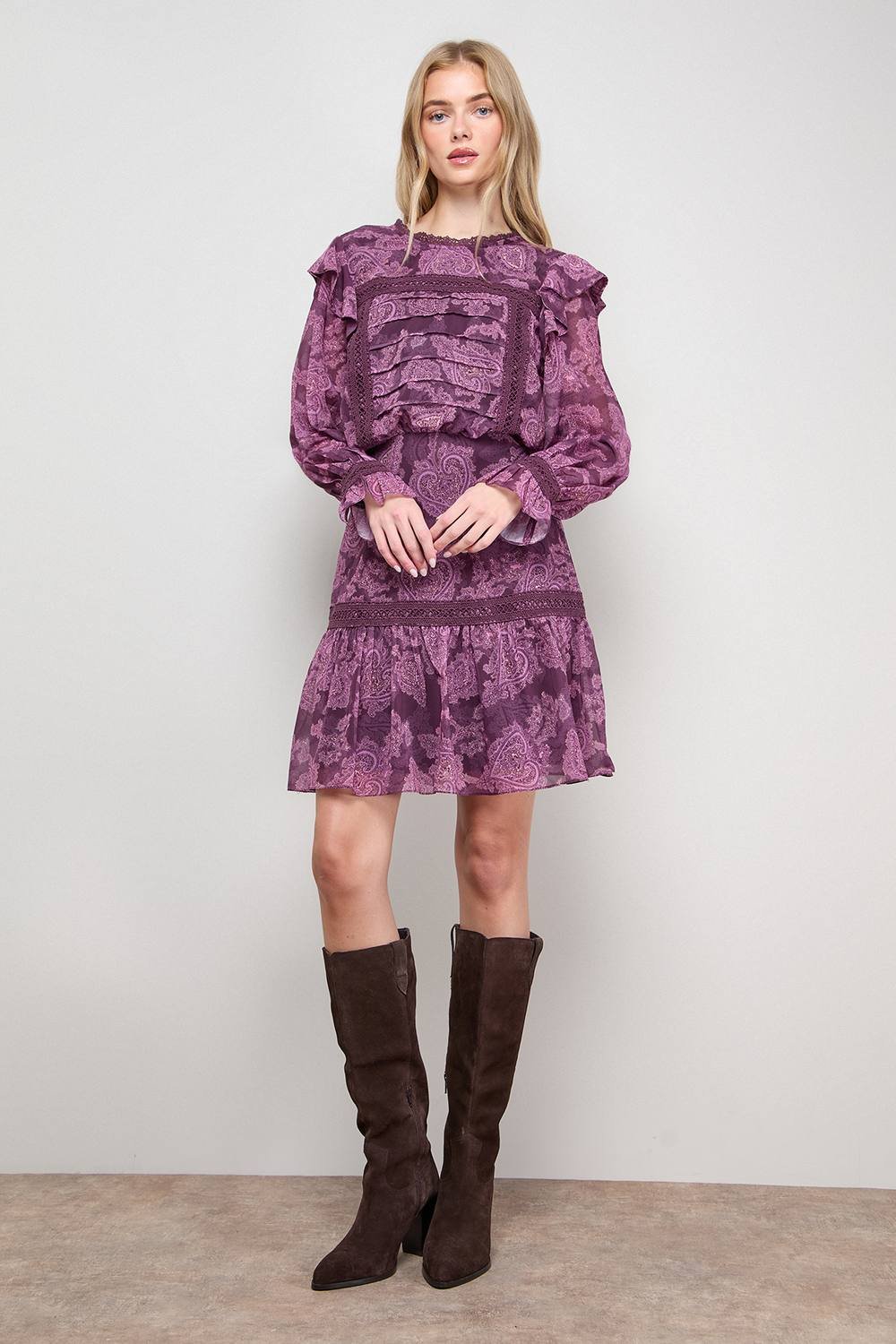 Charming mini dress with delicate lace trim and elegant pleats. Features a flattering crew neckline and flowy long sleeves with subtle ruffles. The tiered skirt adds gentle pleating for a romantic silhouette.