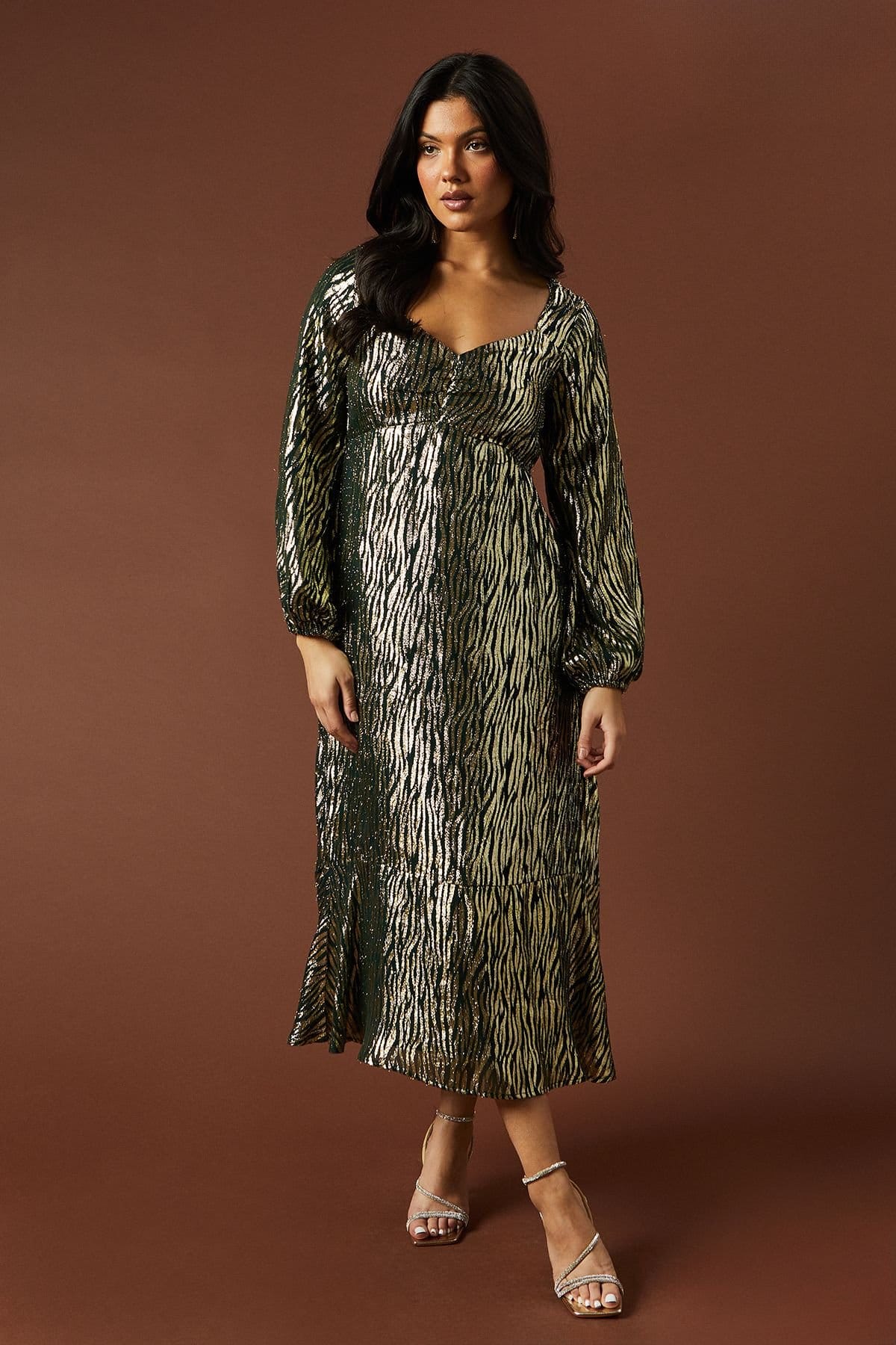 Striking metallic finish for a glamorous sheen. Elegant square neckline frames the dcolletage. Ruched detailing adds texture and flatters the figure. Midi length offers versatile styling options. Voluminous long sleeves create a dramatic silhouette.