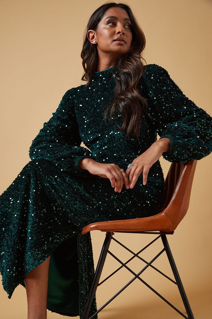 The Oasis Green Velvet Sequin High Neck Midi Dress is available in sizes 8.