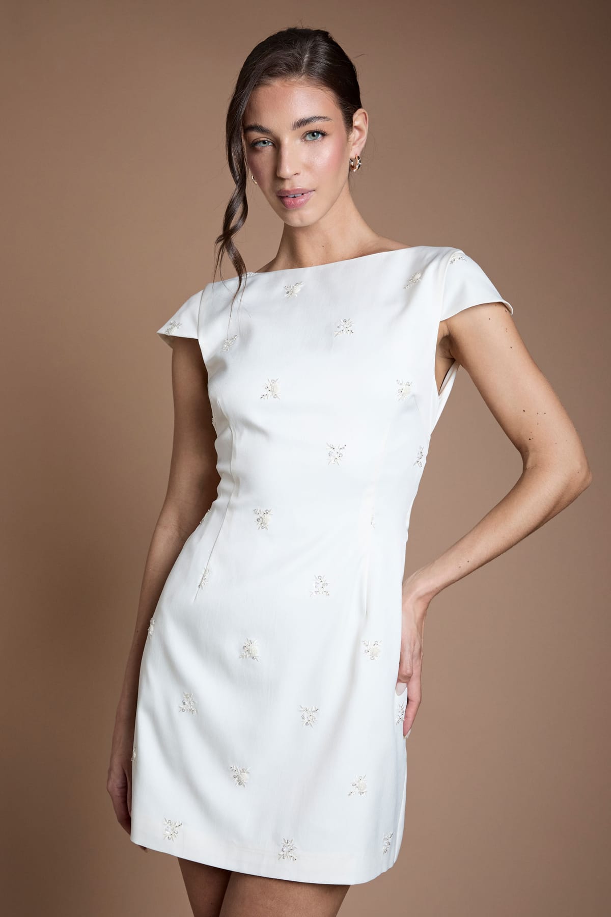 This Ivory mini dress by Oasis features a boat neckline and delicate cap sleeves. The dress boasts scattered embellishment detailing for a touch of sparkle and dimension. Its mini-length design and fitted bodice create a flattering silhouette, while the graceful drape bow adds a romantic bridal aesthetic. The fabric has a slight stretch for comfort.