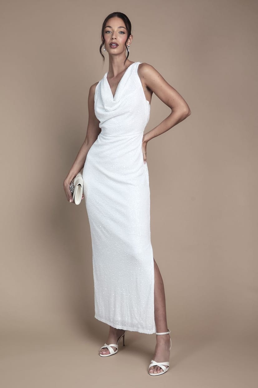 The Oasis Ivory Sequin Cowl Neck Maxi Wedding Dress is ideal for wedding, evening, party.
