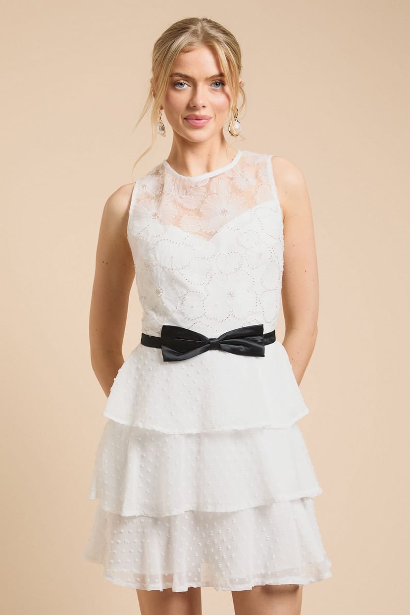The Oasis Ivory Tulle Tiered Mini Dress is ideal for evening, party, wedding-guest.