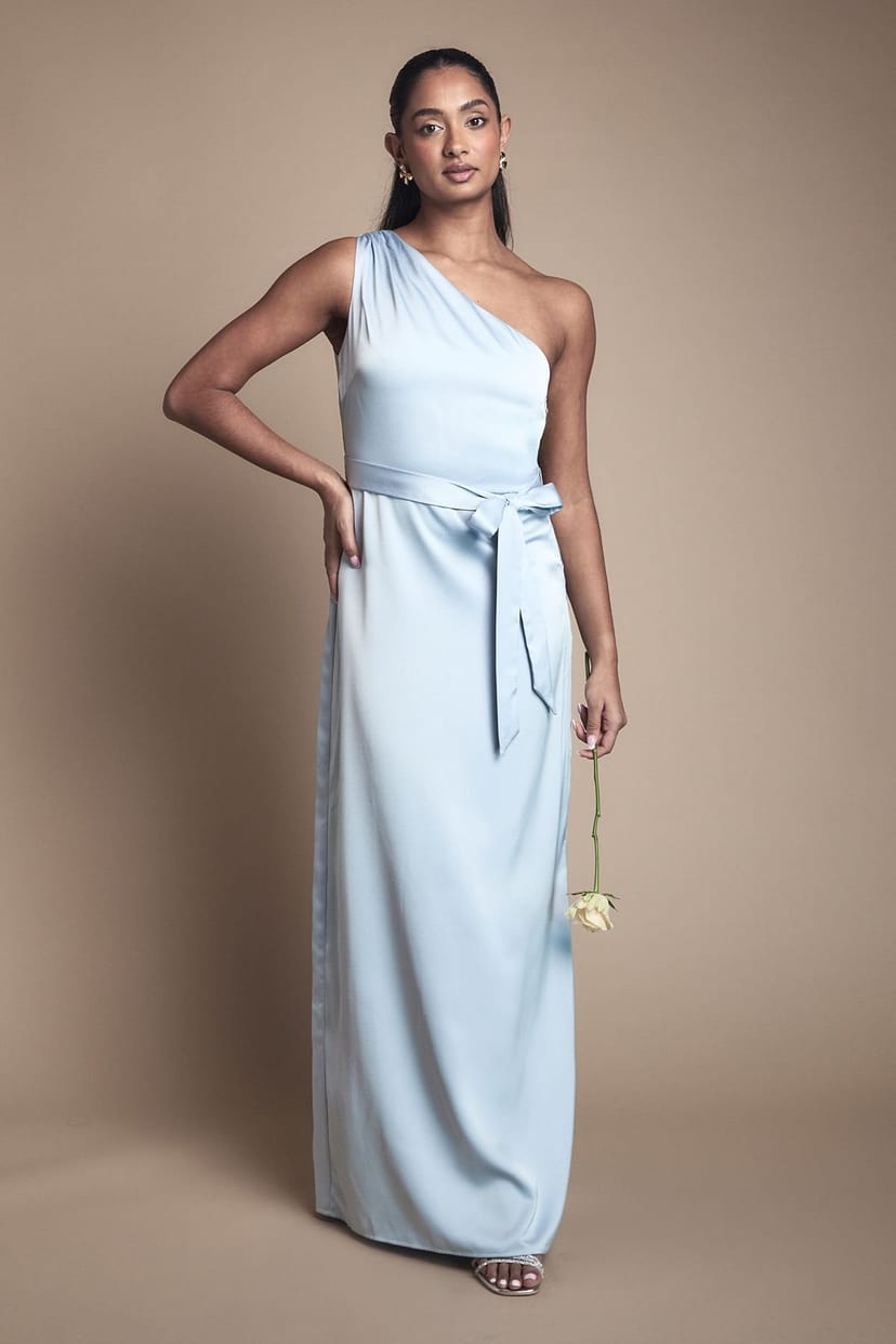 The Oasis Light Blue Satin One Shoulder Maxi Bridesmaid Dress is available in sizes 10, 12, 14, 16.