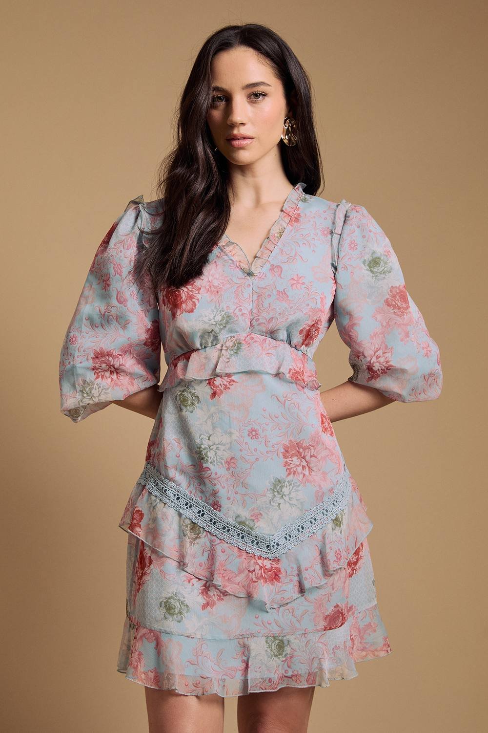 The Oasis Floral Print Bow Detail Dobby Mini Dress is made from chiffon, lace.