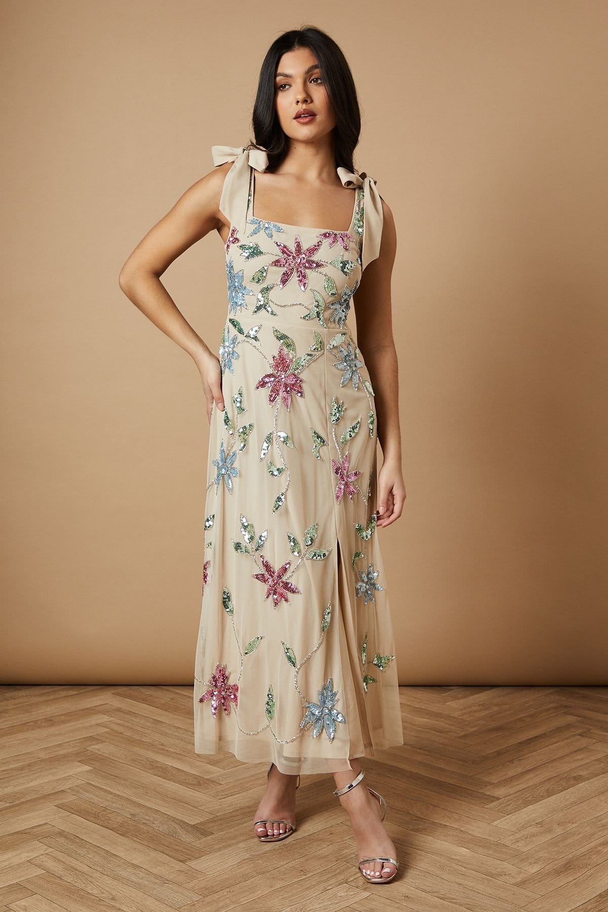 View Debenhams's returns policyThis Oasis dress features a stunning sequin embellished floral design. The square neckline adds a feminine touch, while the tie shoulder straps provide an adjustable fit. The flattering midi length with a subtle flare is perfect for any special occasion. The delicate sheer overlay adds an extra layer of sophistication.