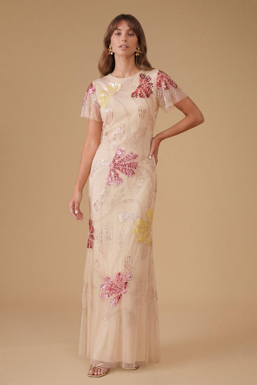 This maxi dress by Oasis features a multicolor fan floral embellished design with angel sleeves and a sheer overlay. Perfect for special occasions with its elegant and glamorous look.