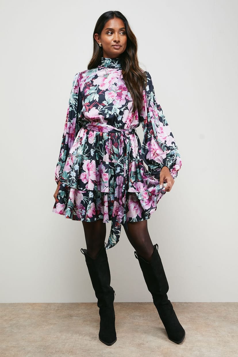 Charming multicolor floral print mini dress with a high neck and voluminous long sleeves. Features a matching fabric belt to define the waistline and a playful tiered skirt with a subtle flounce detail. Made from lightweight woven fabric with full lining for comfort.