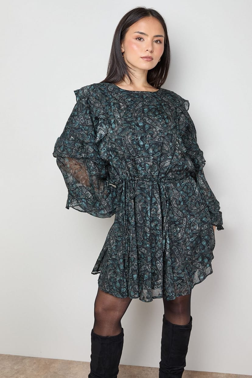 Romantic printed ruffle detailing across the shoulders and sleeves for a feminine silhouette. Distinctive batwing sleeves with multi-tiered ruffles create dramatic volume. Cinched waist design with gathered fabric enhances your natural shape. Flirty mini length perfect for showcasing your favourite boots or heels.